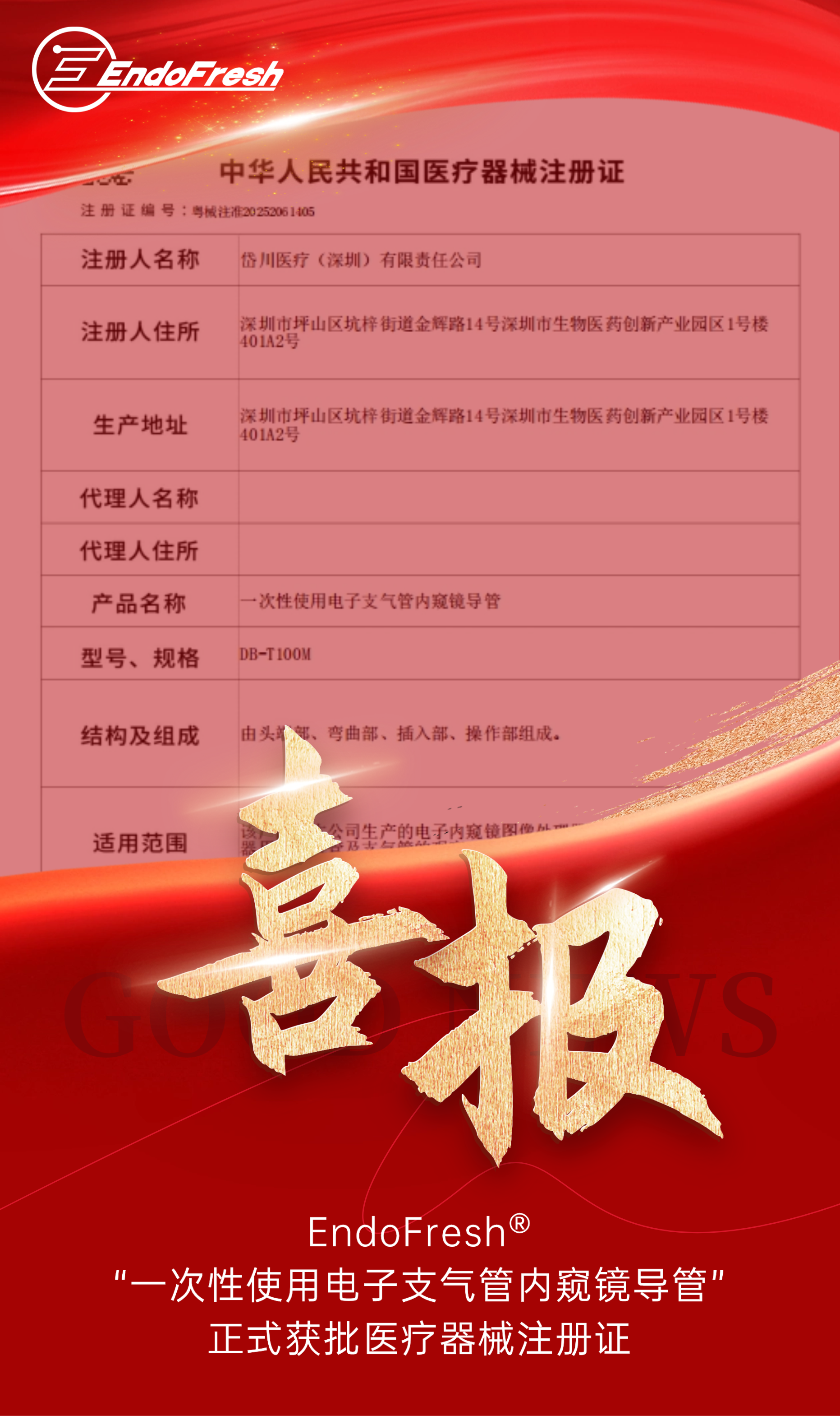 近日,岱川医疗(深圳)有限责任公司自主研发的核心产品——“一次性使用电子支气管内窥镜导管”DB-T100M,正式获得广东省药品监督管理局颁发的医疗器械注册证(注册证编号:粤械注准20252061405)。该产品的成功获批,标志着EndoFresh®向呼吸重症的应用领域迈进的重要里程碑,为呼吸重症用户提供安全精准且全面的解决方案。