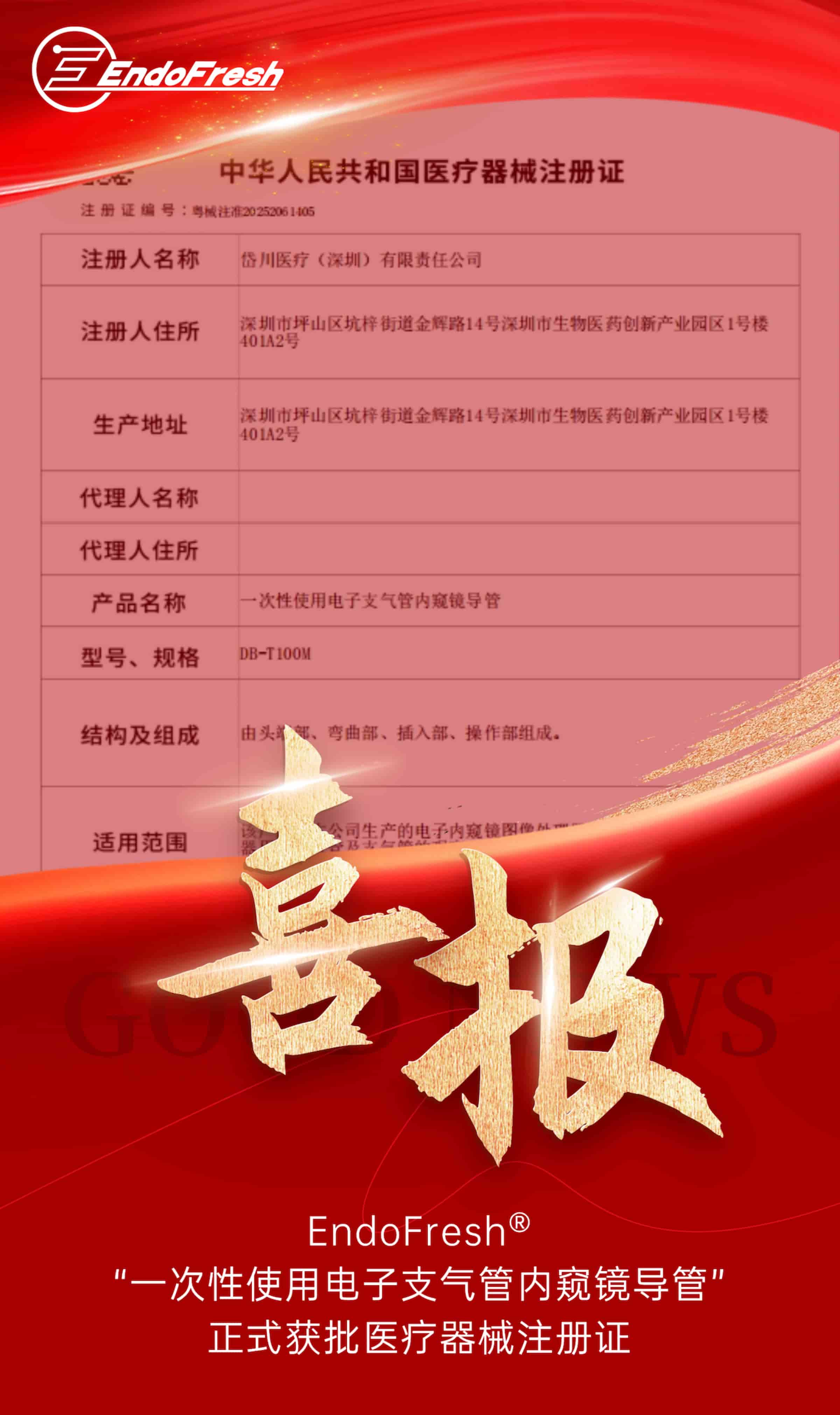 Recently, a core product independently developed by Duochuan Medical (Shenzhen) Co., Ltd.—the DB-T100M electronic single-use bronchoscope catheter—officially received its medical device registration certificate from the Guangdong Medical Products Administration (Registration No.: 粤械注准20252061405).